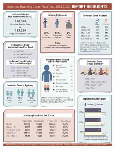 This publicly available dashboard will increase access and transparency among Baker Act-receiving facilities, identify regional and geographic trends including areas with high utilization, repeat admissions, settings where and reasons why initiations occur, and allow for timely updates on Baker Act initiation and demographic breakdowns, including by age.